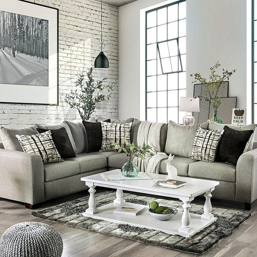 FOA WestBasie Gray Love Seat, 68"L X 37"W X 42"H, 123lbs. A slightly modern color palette gives this sofa collection a hint of contemporary charm that make...